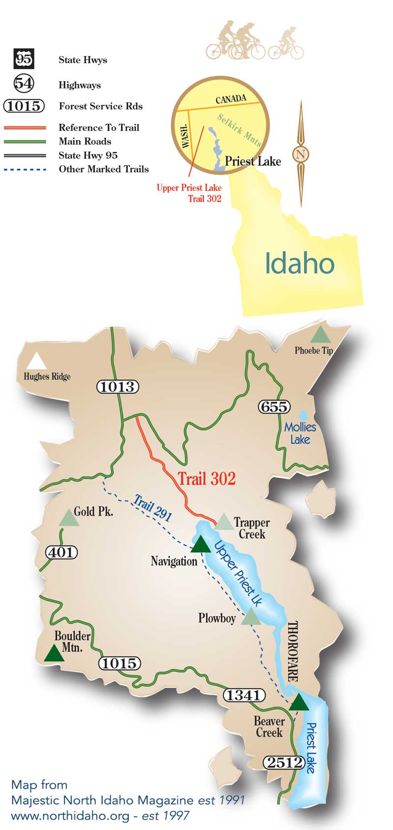 The route to the Trail 302 trailhead is via USFS Road 302 (an extension of State Highway 57) from Nordman. Travel 21 miles north on USFS Road 302 and 1013 over Granite Pass to USFS Road 655. Turn right onto Road 655 and proceed for approximately 1/2 mile. Trailhead is located on Road 655 and ends at Trapper Campground on the east side of Upper Priest Lake. The trailhead will be on your right and the vehicle parking area to your left, across from the trailhead.